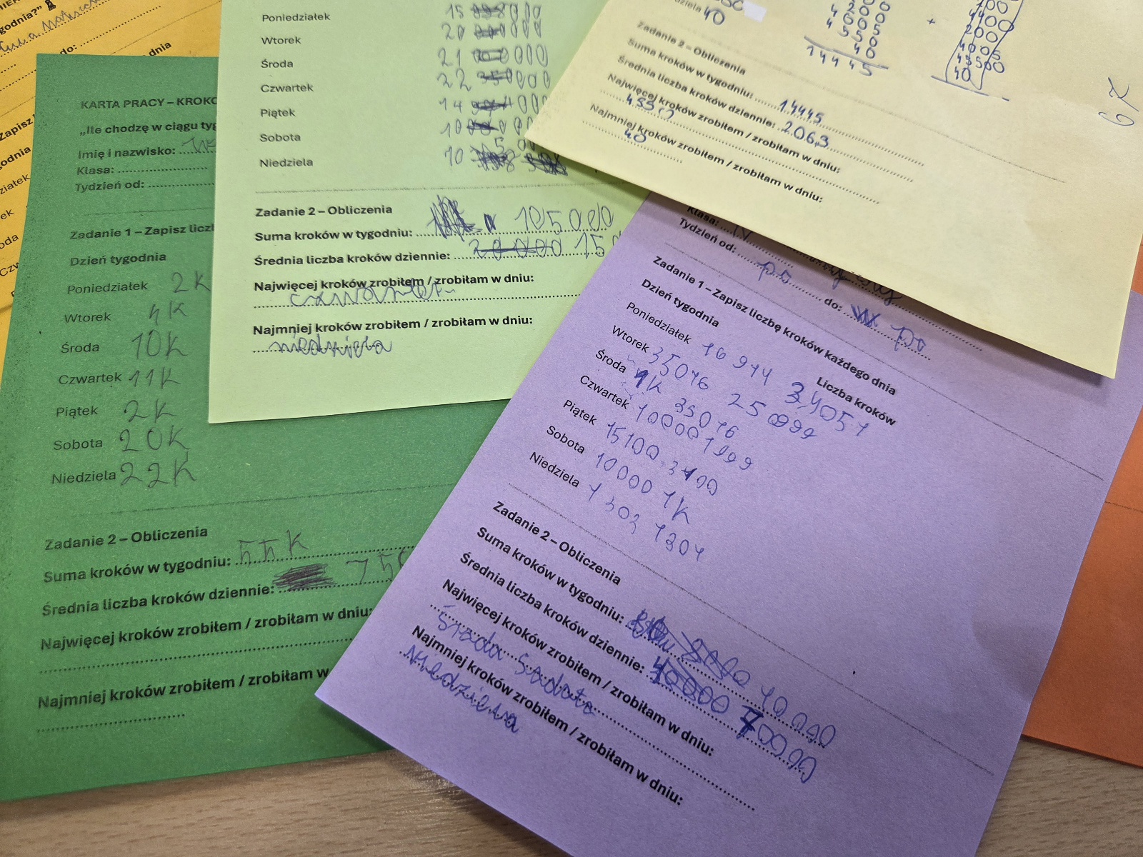 Po tygodniu wspólnie opracowaliśmy zebrane dane – stworzyliśmy tabelę, obliczyliśmy średnią dzienną liczbę kroków oraz łączną liczbę kroków z całego tygodnia. Dzięki temu uczniowie mogli zobaczyć, jak matematyka pomaga analizować informacje z naszego codziennego życia.